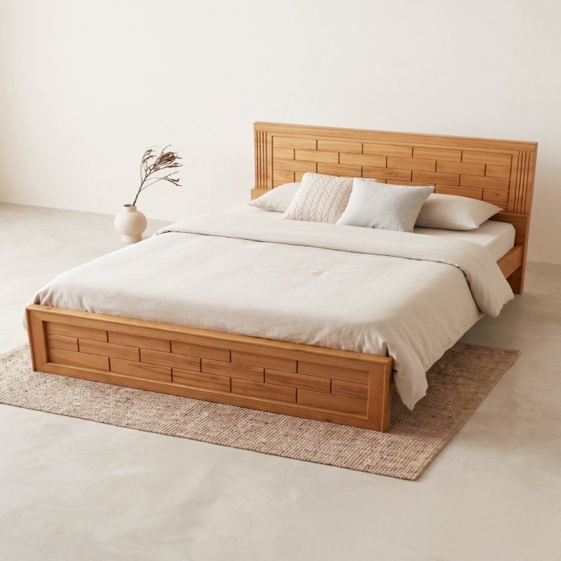 This elegant bed frame is a masterclass in craftsmanship, featuring a unique brick-style block pattern on both the headboard and footboard. Constructed from premium solid wood, it showcases a rich, natural grain with a warm honey finish that adds a sophisticated touch to any bedroom