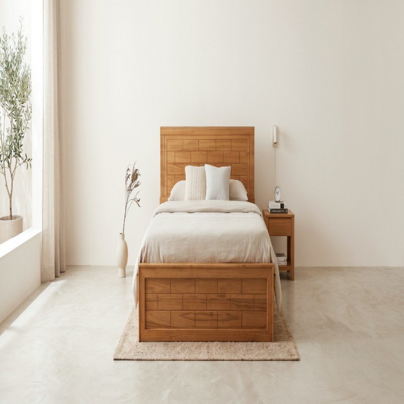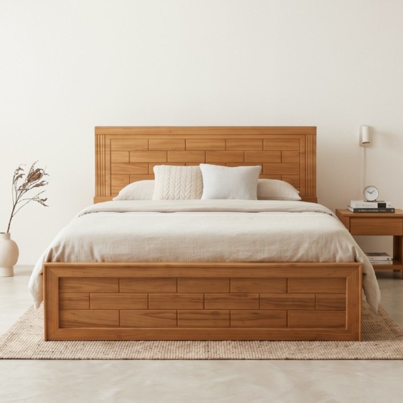 This elegant bed frame is a masterclass in craftsmanship, featuring a unique brick-style block pattern on both the headboard and footboard. Constructed from premium solid wood, it showcases a rich, natural grain with a warm honey finish that adds a sophisticated touch to any bedroom